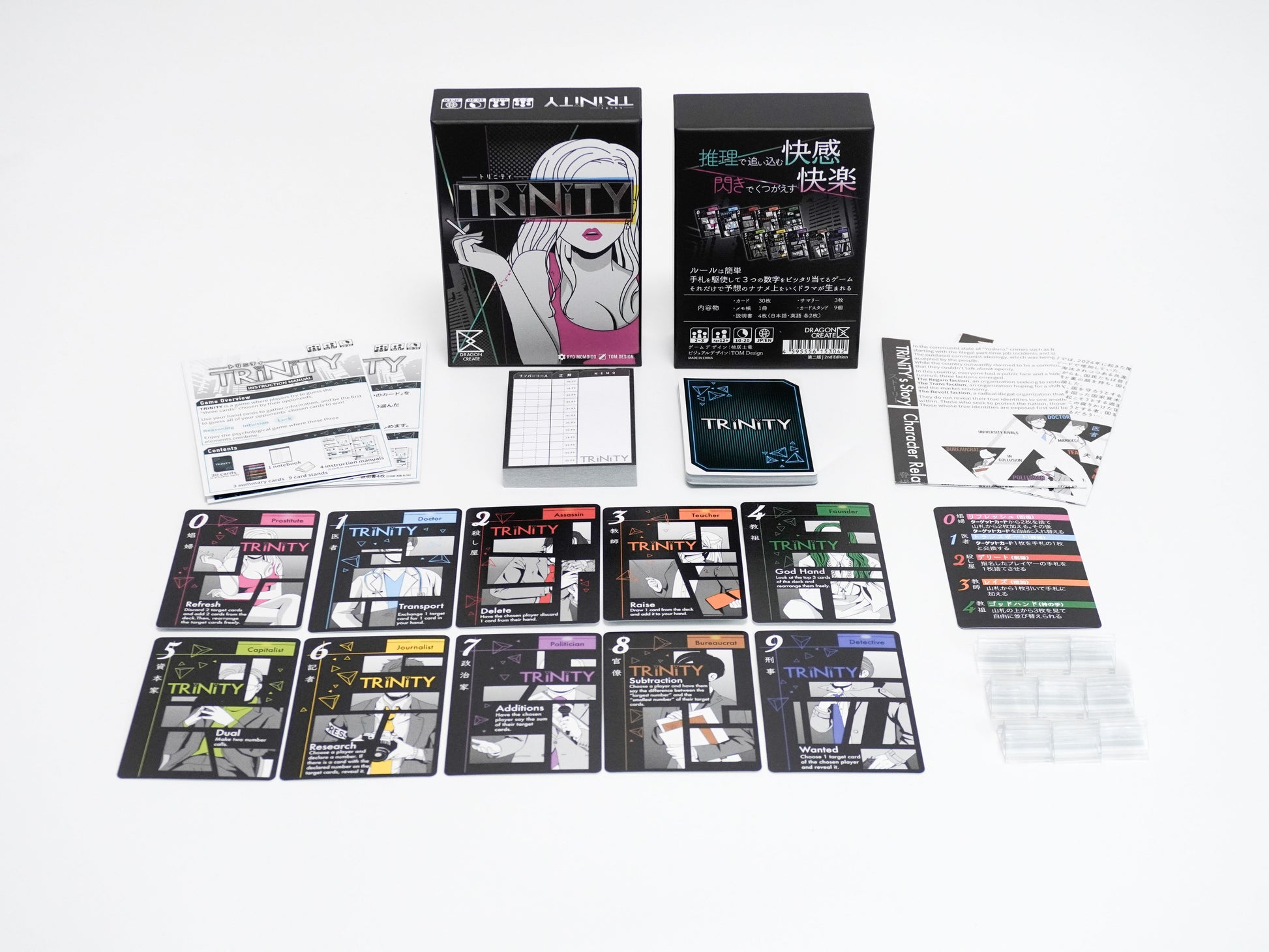 In TRiNiTY, players will attempt to guess, in order, the numbers of the three target cards their opponent chose at the beginning of the game. Below is a brief overview of the game. More detailed rules can be found in the rulebook included with your purchase.